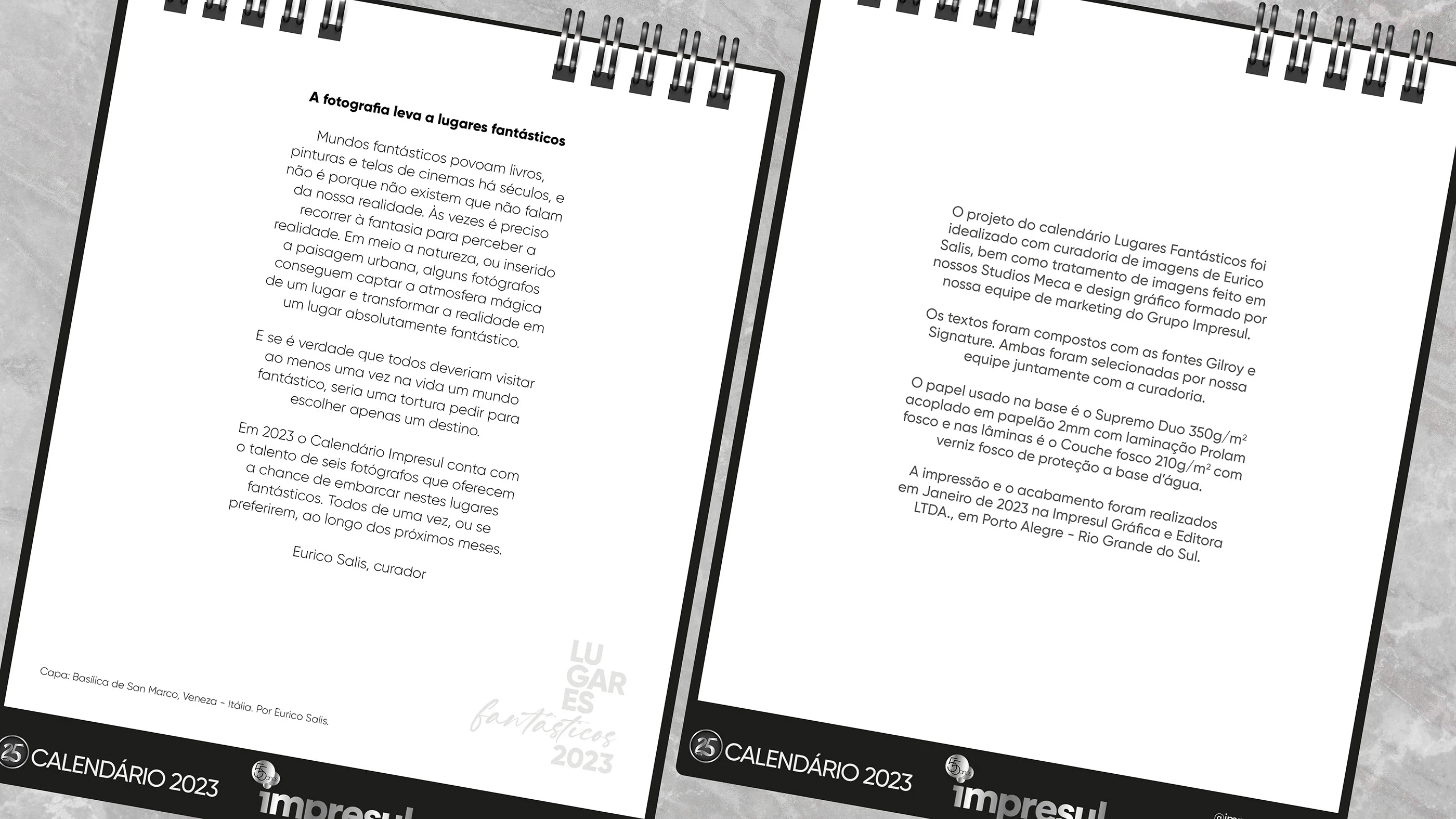 Com a curadoria de fotos de Eurico Salis, participação de seis fotógrafos renomados, design e tratamento de imagem desenvolvido pelos Studios Meca e produção em no maior parque gráfico do sul do Brasil, esperamos trazer a você não apenas um simples calendário, mas, uma obra que pode lhe expandir horizontes unindo o impresso e o mundo virtual, abrindo espaço para novas ideias.