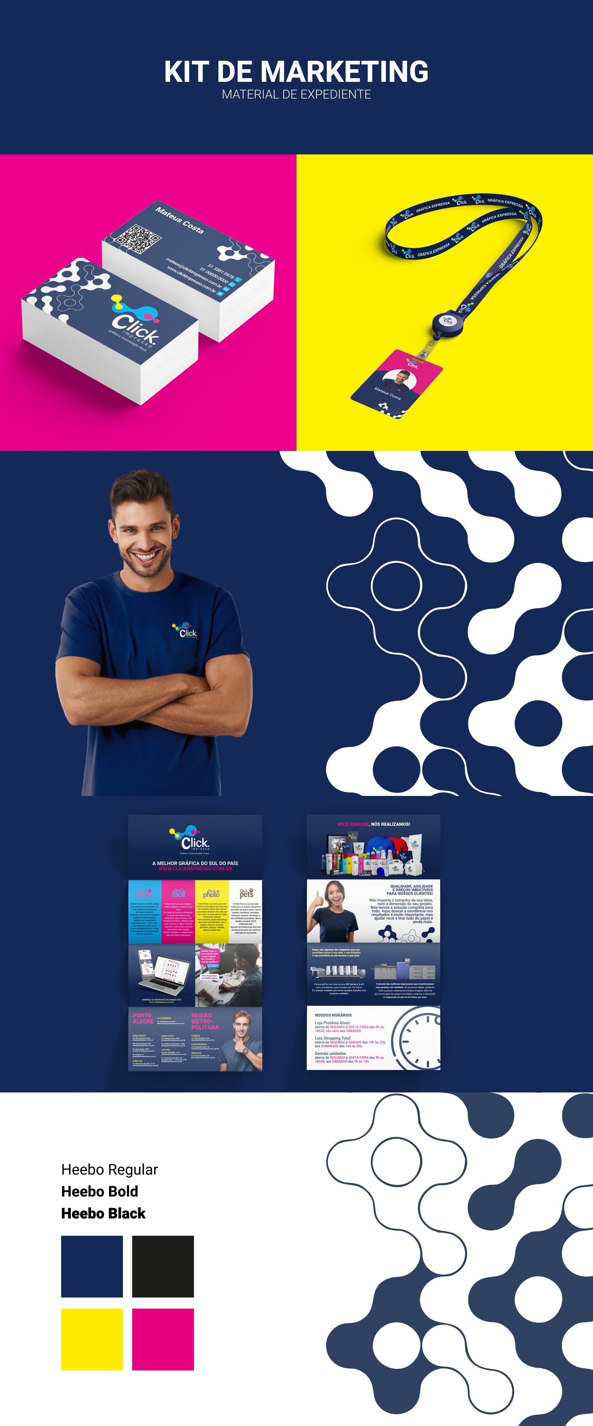 Para garantir a consistência e o profissionalismo da marca nos pontos de contato da equipe, foi criado um kit de marketing essencial. Este conjunto de materiais incluiu o design de cartões de visita para os funcionários, crachás de identificação, camisetas de uniforme e um flyer informativo com os serviços da empresa.