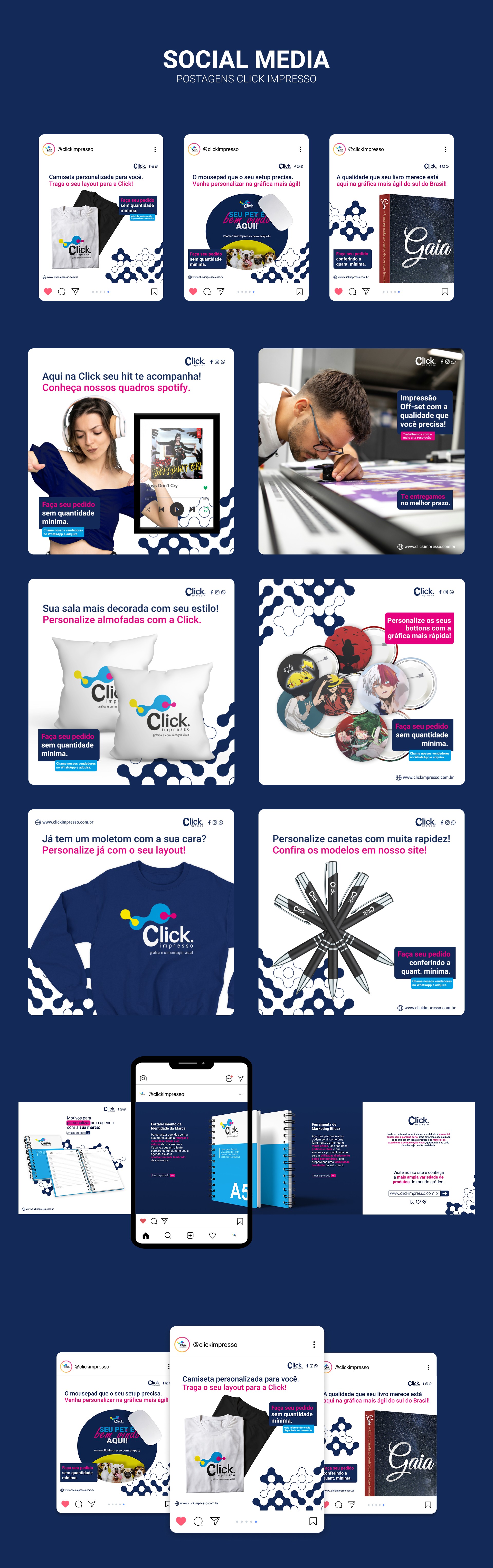 Foi desenvolvida uma linha editorial visual para as redes sociais com o objetivo de promover a diversidade de produtos e serviços da gráfica. Para tangibilizar as possibilidades de impressão, foram criados posts estáticos e carrosséis que utilizavam mockups de alta qualidade como exemplos.