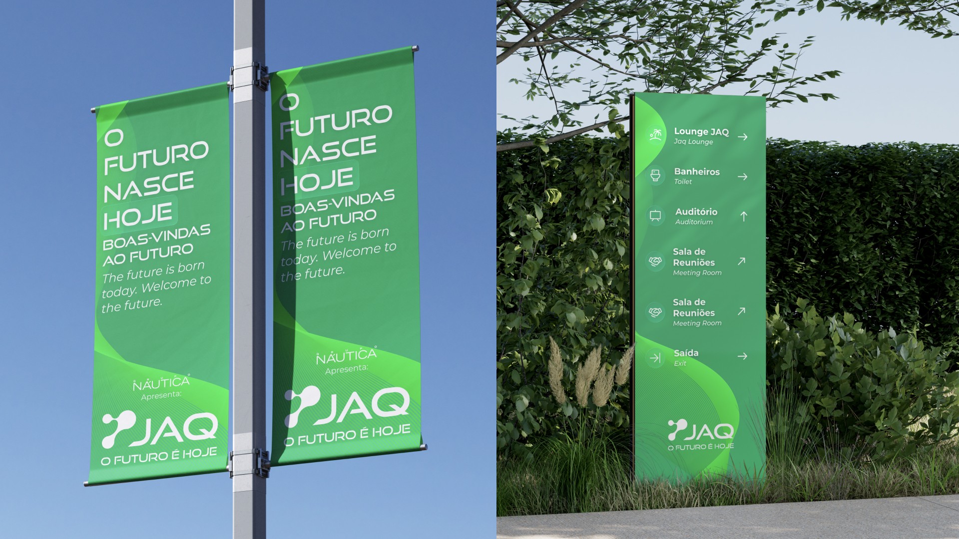 Para garantir a consistência da marca em todos os pontos de contato, foi desenvolvida uma suíte completa de materiais de comunicação. Isso incluiu o design de panfletos informativos, cartões de visita, banners para eventos e pitch decks (apresentações para investidores), assegurando que a identidade da JAQ fosse aplicada de forma profissional e coerente em contextos online e offline.