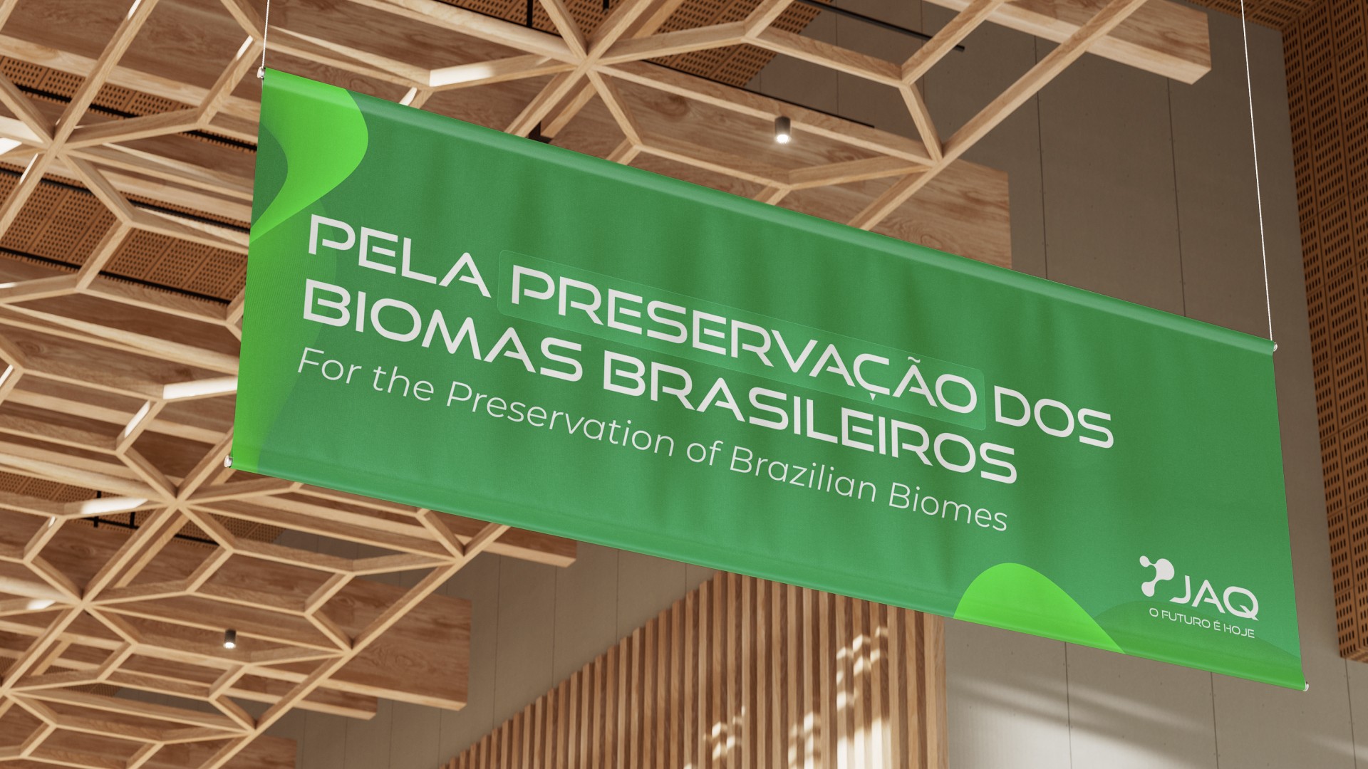 O ponto de partida foi a criação da marca JAQ. Foi desenvolvido um logo e um sistema visual que refletem a fusão entre tecnologia e natureza. O design buscou transmitir inovação, sustentabilidade e confiança, estabelecendo um tom profissional para a comunicação da empresa.