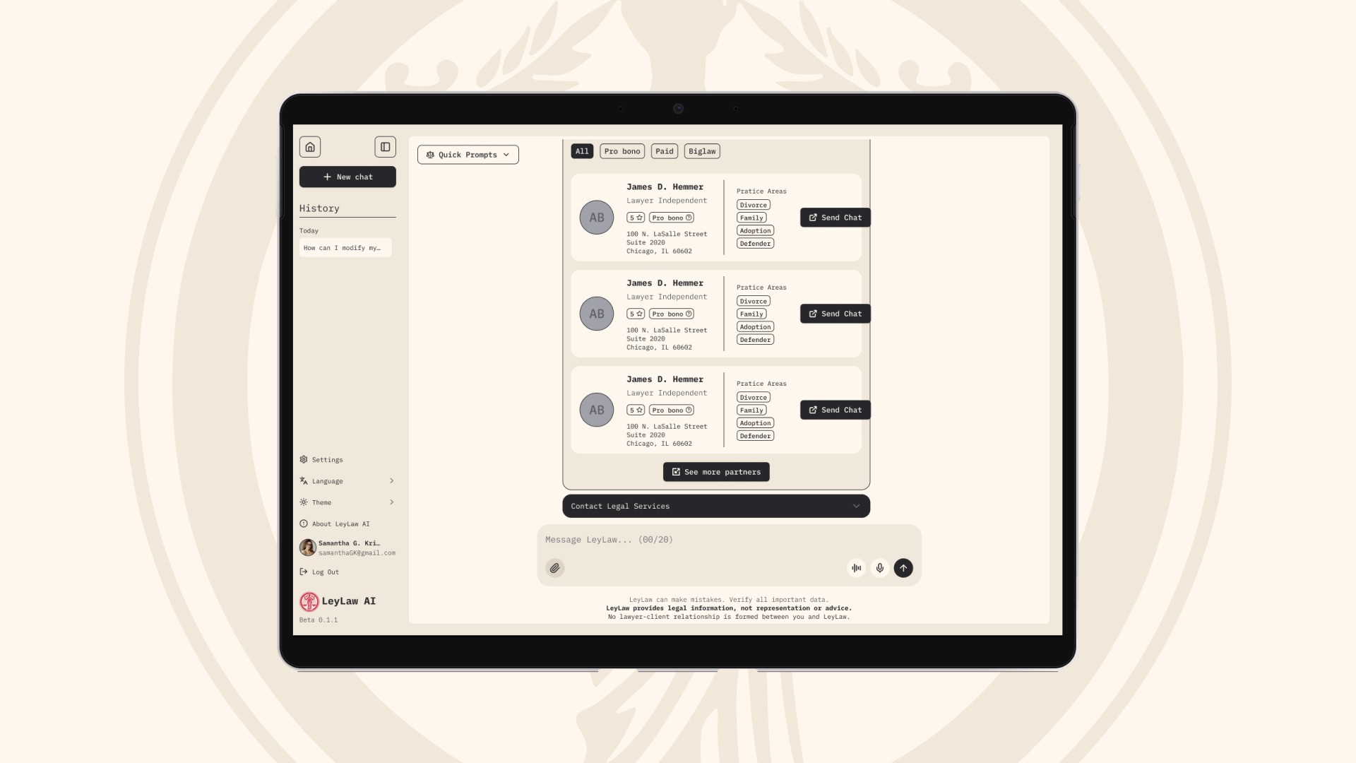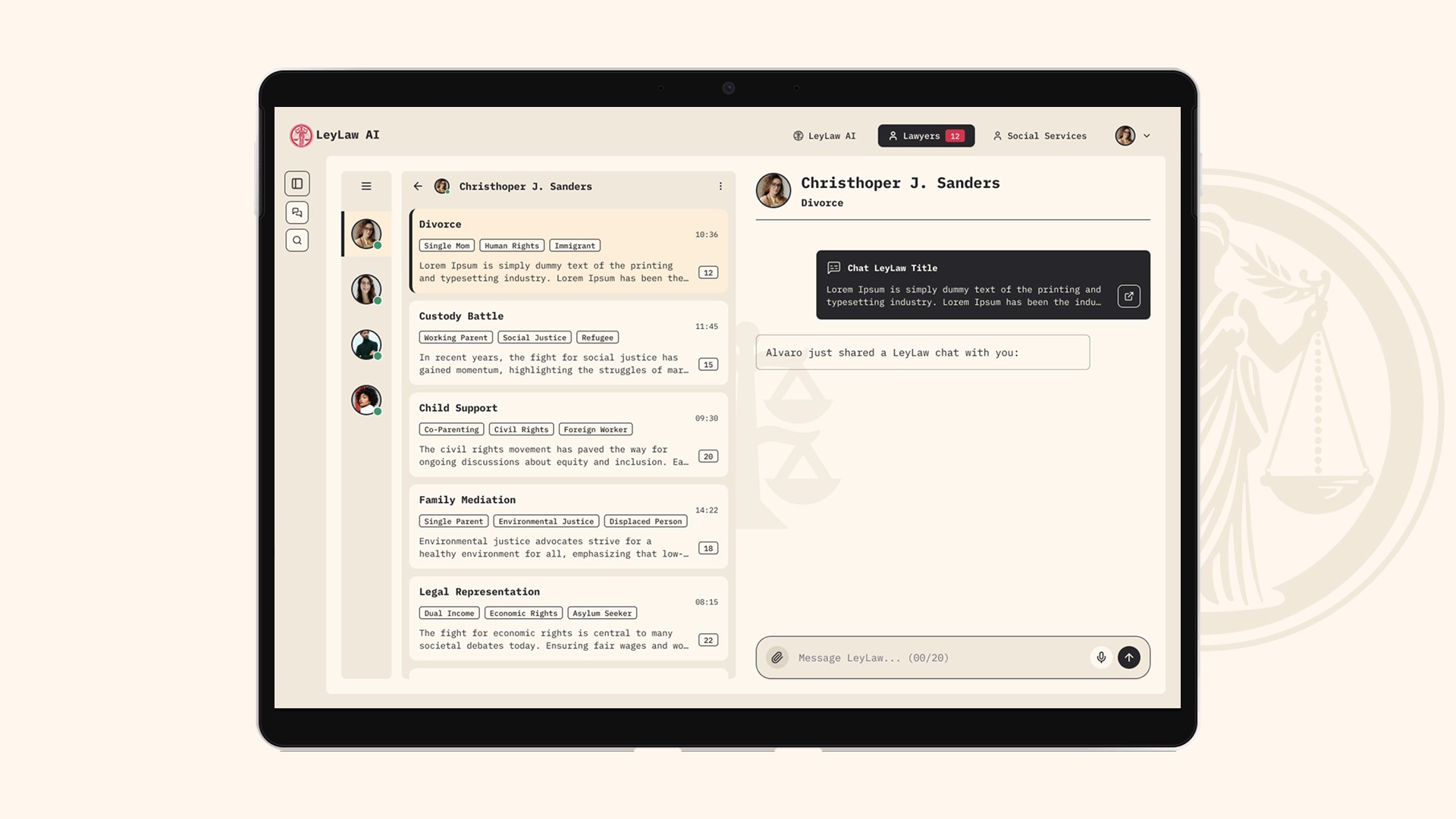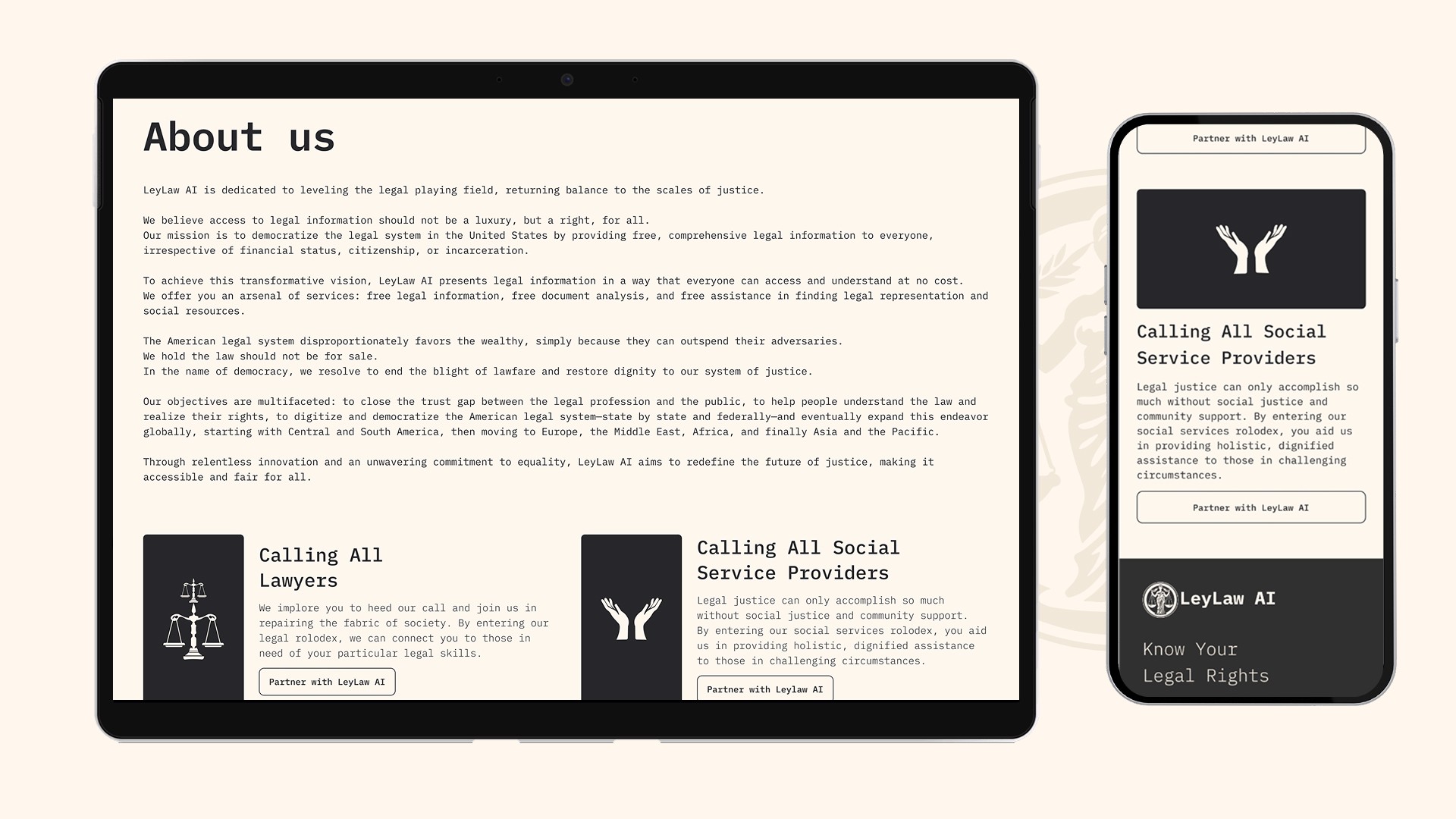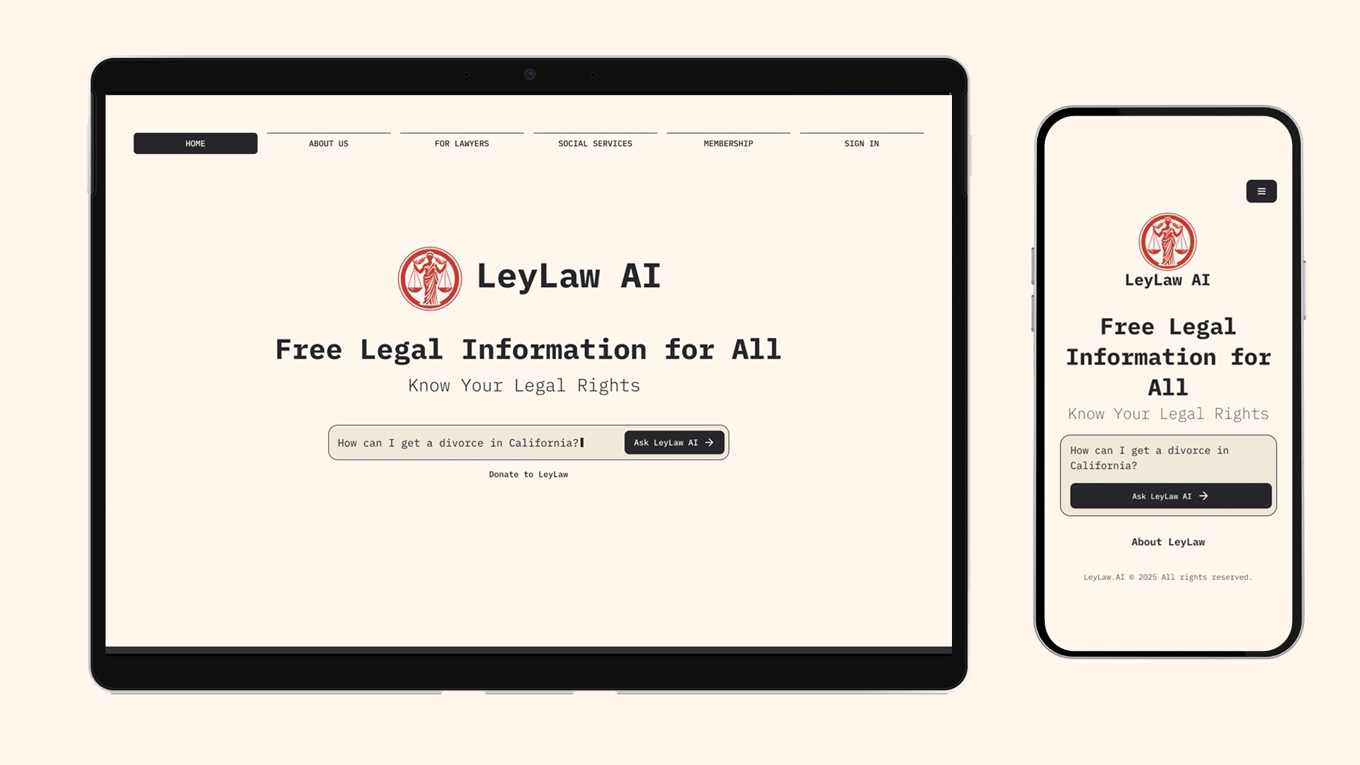 A LeyLaw AI é uma startup americana com a missão de democratizar o acesso ao sistema legal nos Estados Unidos. Utilizando inteligência artificial, a plataforma oferece informações legais gratuitas e abrangentes, conectando pessoas que precisam de ajuda com advogados qualificados.