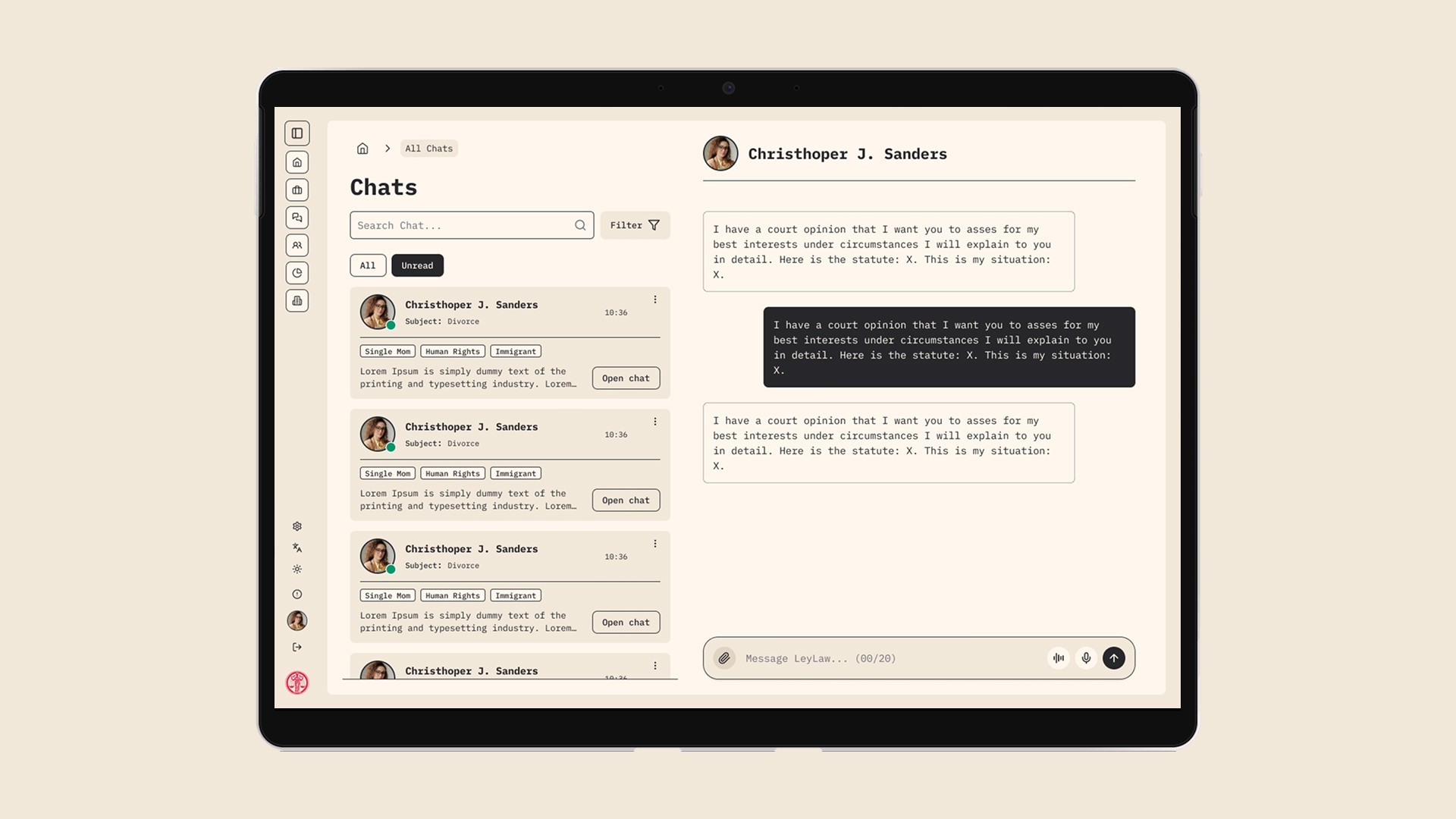 Hub de Conversas: Após a conexão, o usuário gerencia suas diversas conversas com diferentes advogados em uma interface unificada, com um design funcional inspirado no "WhatsApp Web".