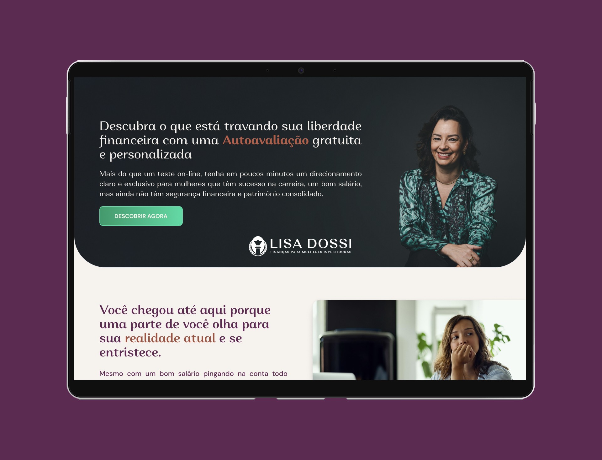 O objetivo do projeto era criar uma landing page de alta performance para a principal ferramenta de "isca digital" (lead magnet) da cliente: uma autoavaliação gratuita. O desafio era desenhar uma página que, utilizando a identidade visual existente de Lisa Dossi, convencesse a visitante do valor dessa ferramenta e a motivasse a se cadastrar, capturando leads qualificados para o funil de vendas da mentoria.