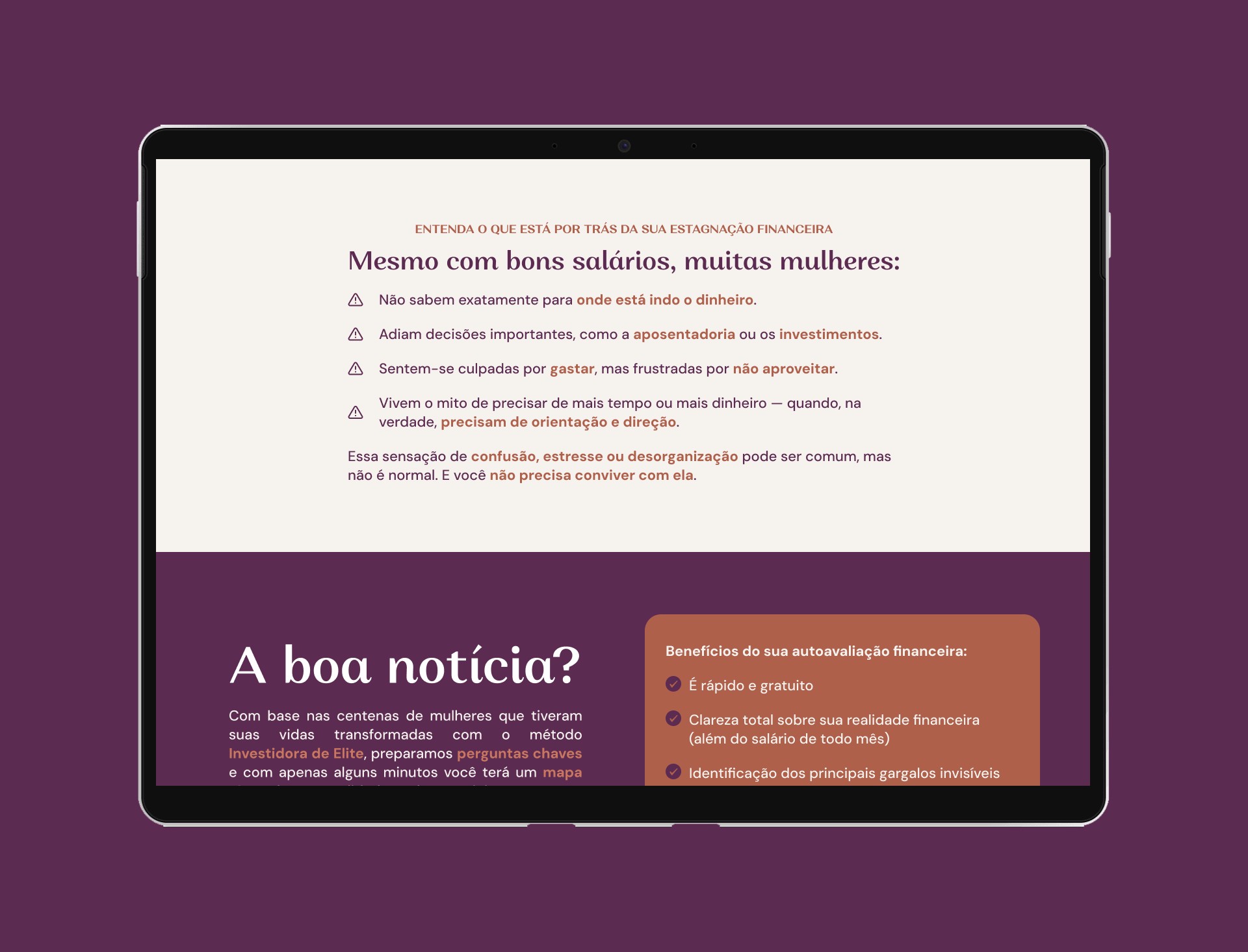 Reforço de Valor: Em seguida, uma seção em formato de lista destaca os motivos "por que" a usuária deve realizar a autoavaliação, quebrando objeções e reforçando os benefícios diretos.
