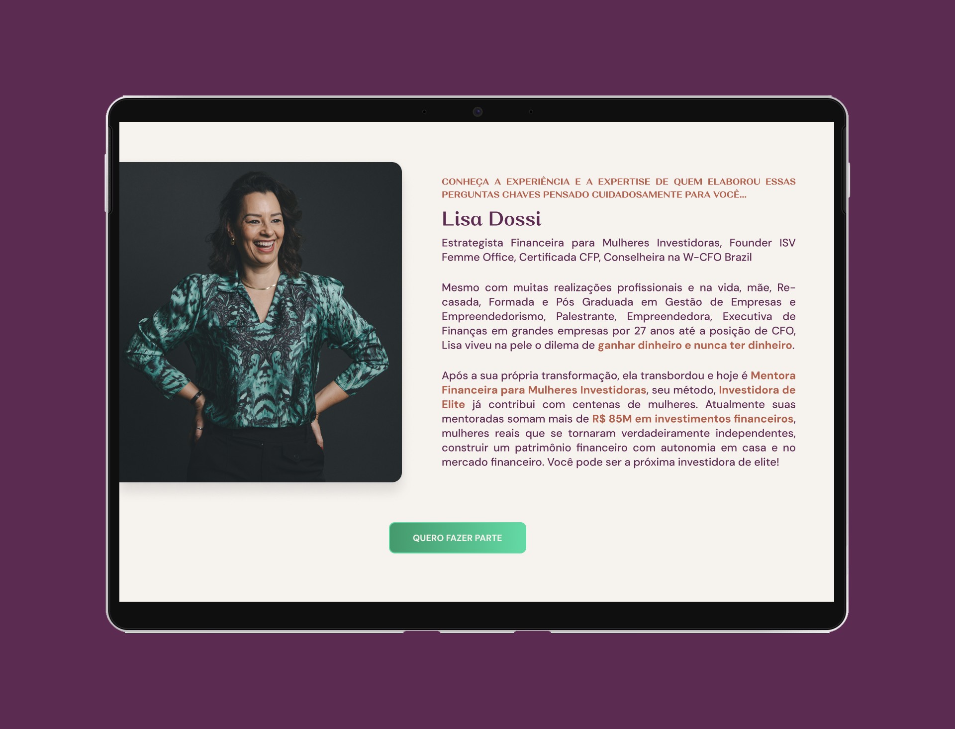 Lisa Dossi é uma mentora de finanças com foco em capacitar e guiar mulheres investidoras, ajudando-as a tomar melhores decisões financeiras e a construir seu patrimônio.