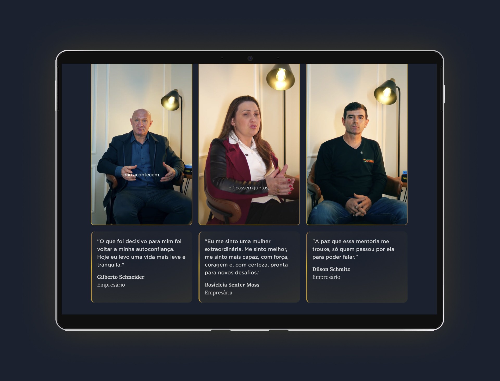 Prova Social: Utiliza uma seção de depoimentos em vídeo, acompanhados por frases de destaque, para oferecer uma prova social autêntica e de alto impacto.