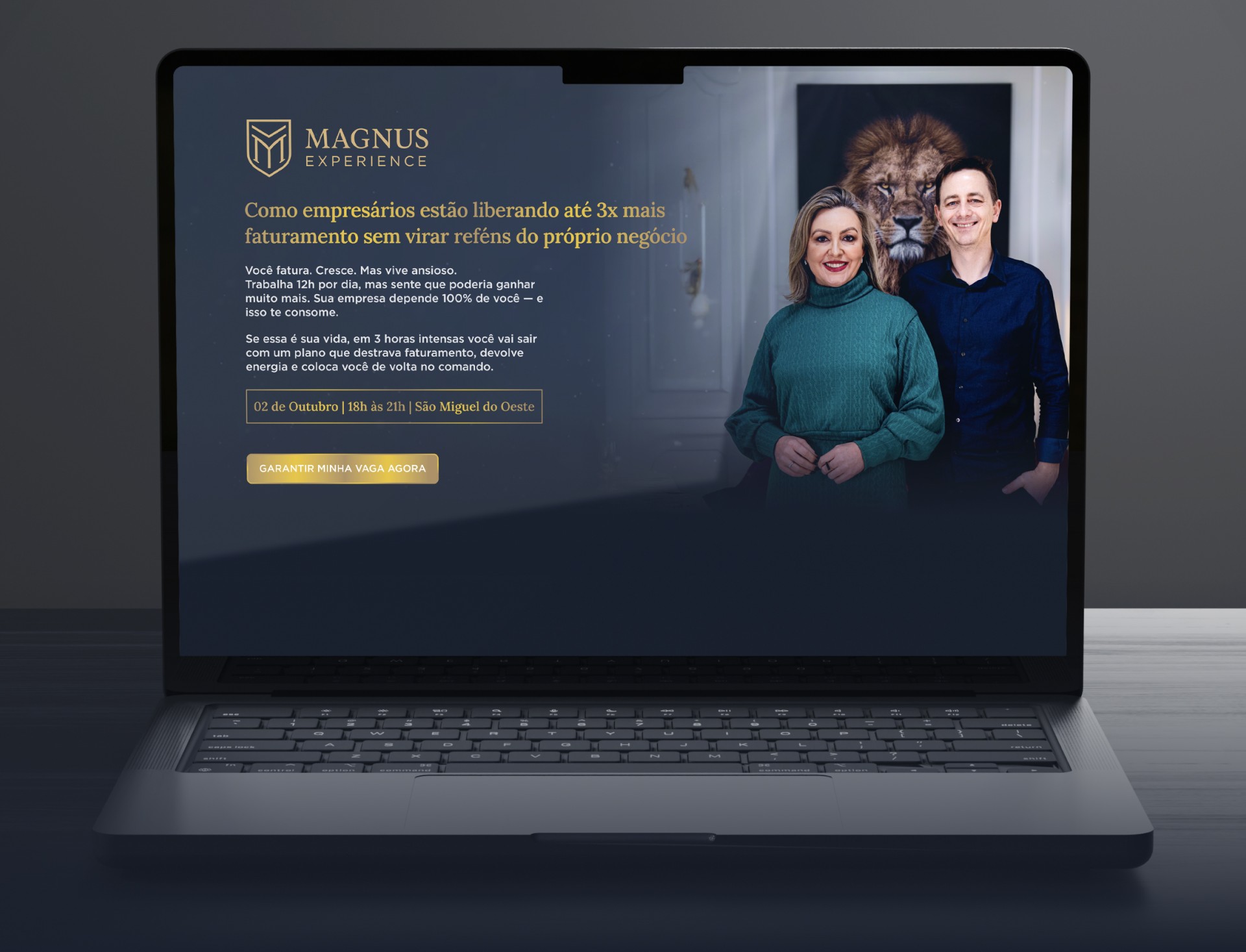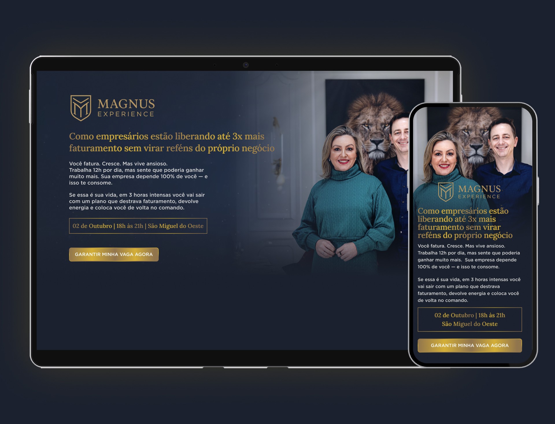 O projeto Magnus consistiu na criação de uma landing page de alta conversão para um workshop exclusivo. O principal objetivo estratégico era posicionar a marca como uma oferta de "qualidade premium" em sua cidade de atuação, destacando-se da concorrência local através de uma estética sofisticada.