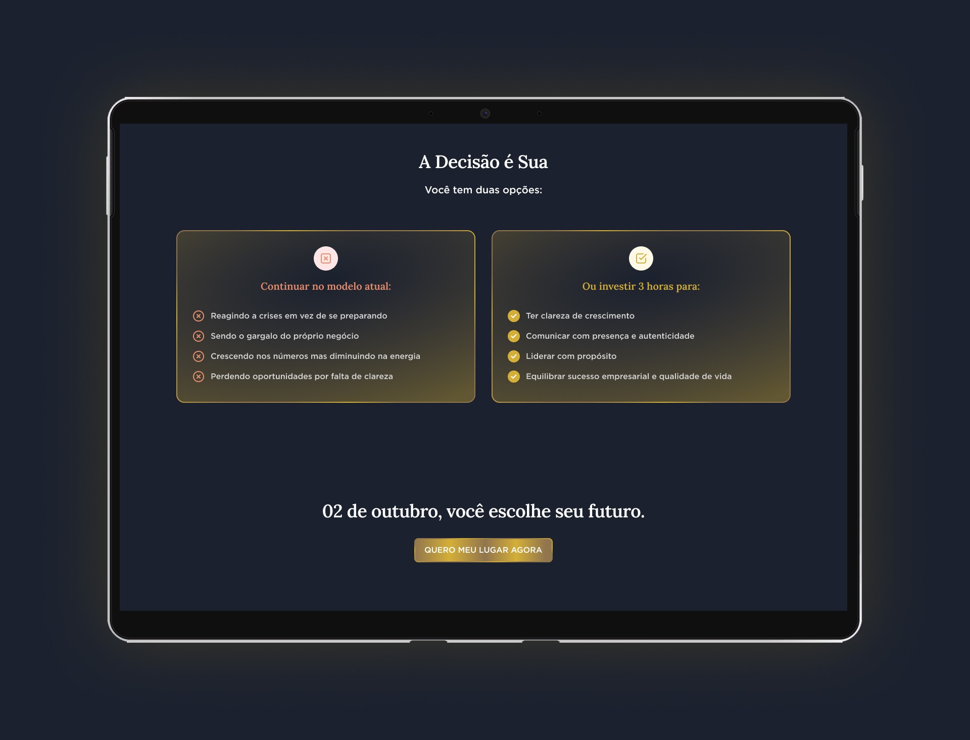 O desafio era puramente de posicionamento. A landing page precisava ser a principal ferramenta para construir a percepção de valor da marca. Cada elemento visual e textual deveria comunicar sofisticação, autoridade e exclusividade, justificando o posicionamento premium e guiando o usuário à conversão.