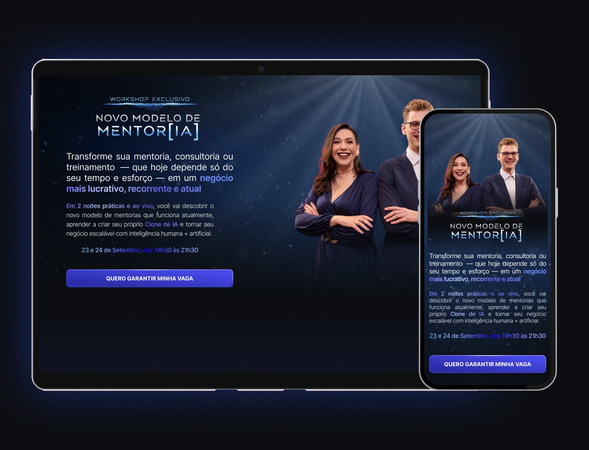 1. Direção de Arte e Impacto Imediato: Para capturar a atenção e estabelecer o tema de inovação, a página utiliza uma estética "high tech", dominada por degradês de azul, uma cor fortemente associada à tecnologia. A hero section é o ponto focal, destacando os dois palestrantes mentores com um fundo dinâmico e animado, criando uma primeira impressão de alto impacto.