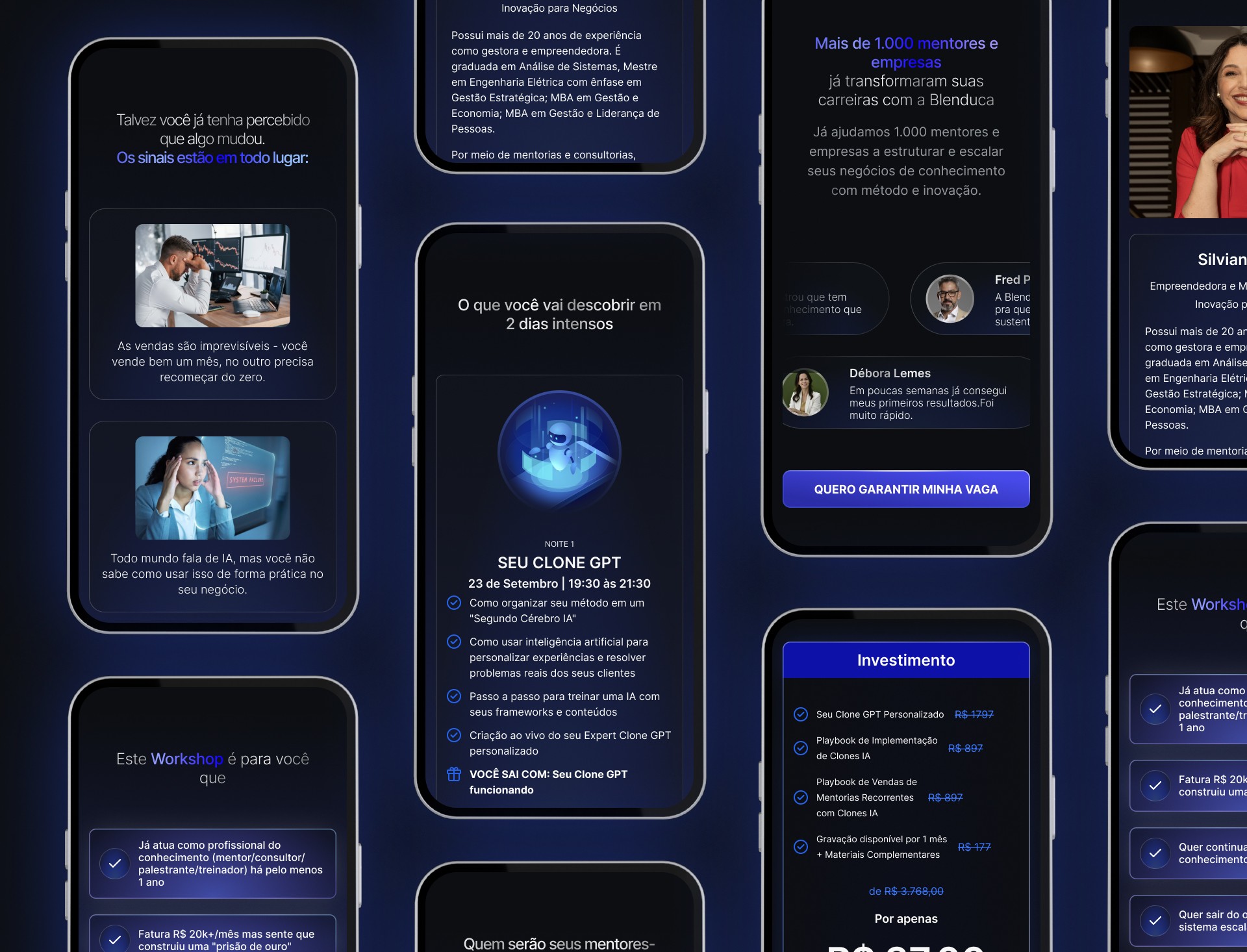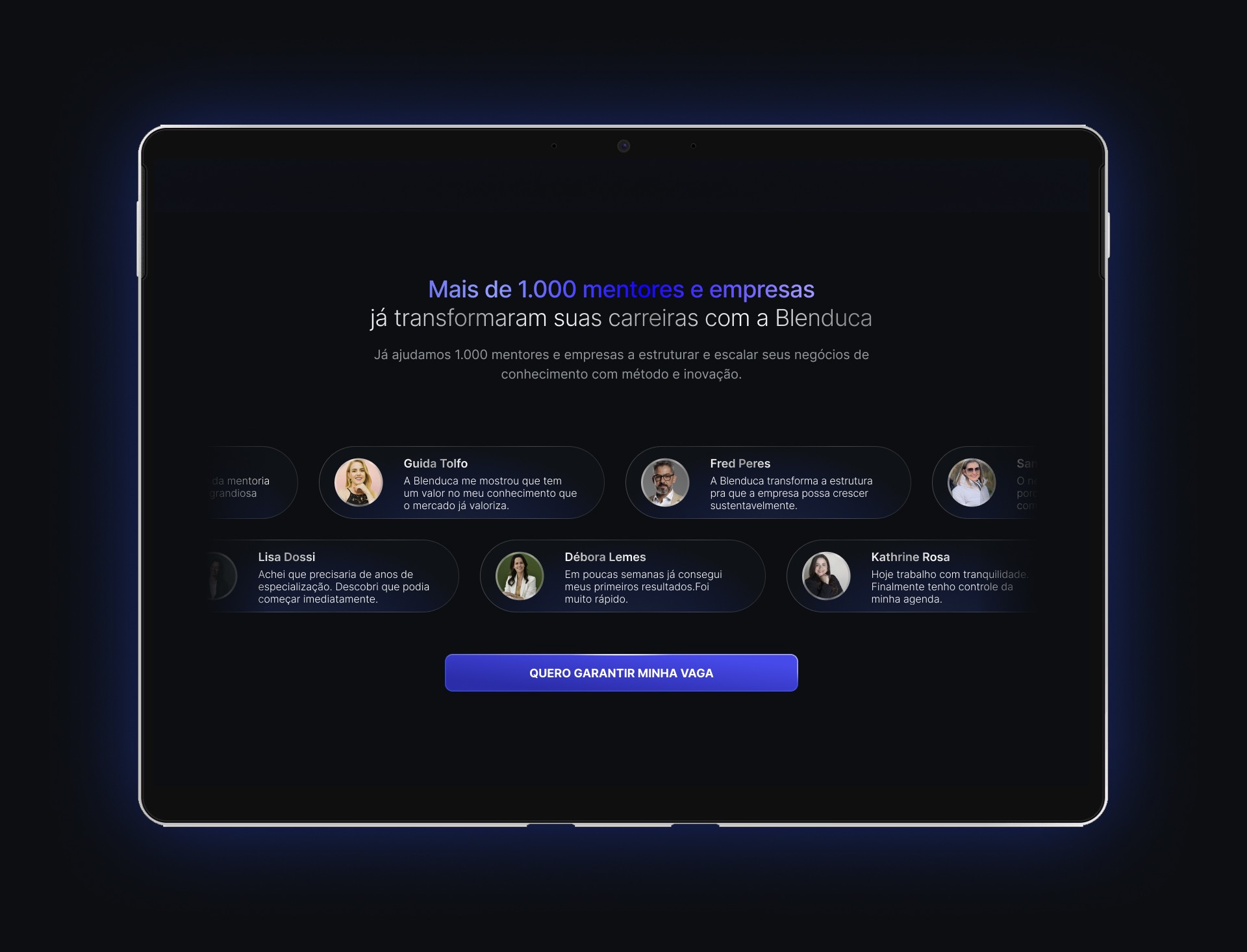 4. Prova Social (A Confiança): A seção de maior impacto da página é dedicada à prova social. Um carrossel de rolagem horizontal exibe dezenas de depoimentos sob o título "Mais de 1.000 mentores e empresas já transformaram suas carreiras com a Blenduca". Este design cria um senso de movimento e abundância, demonstrando de forma convincente a autoridade e o sucesso de projetos anteriores.