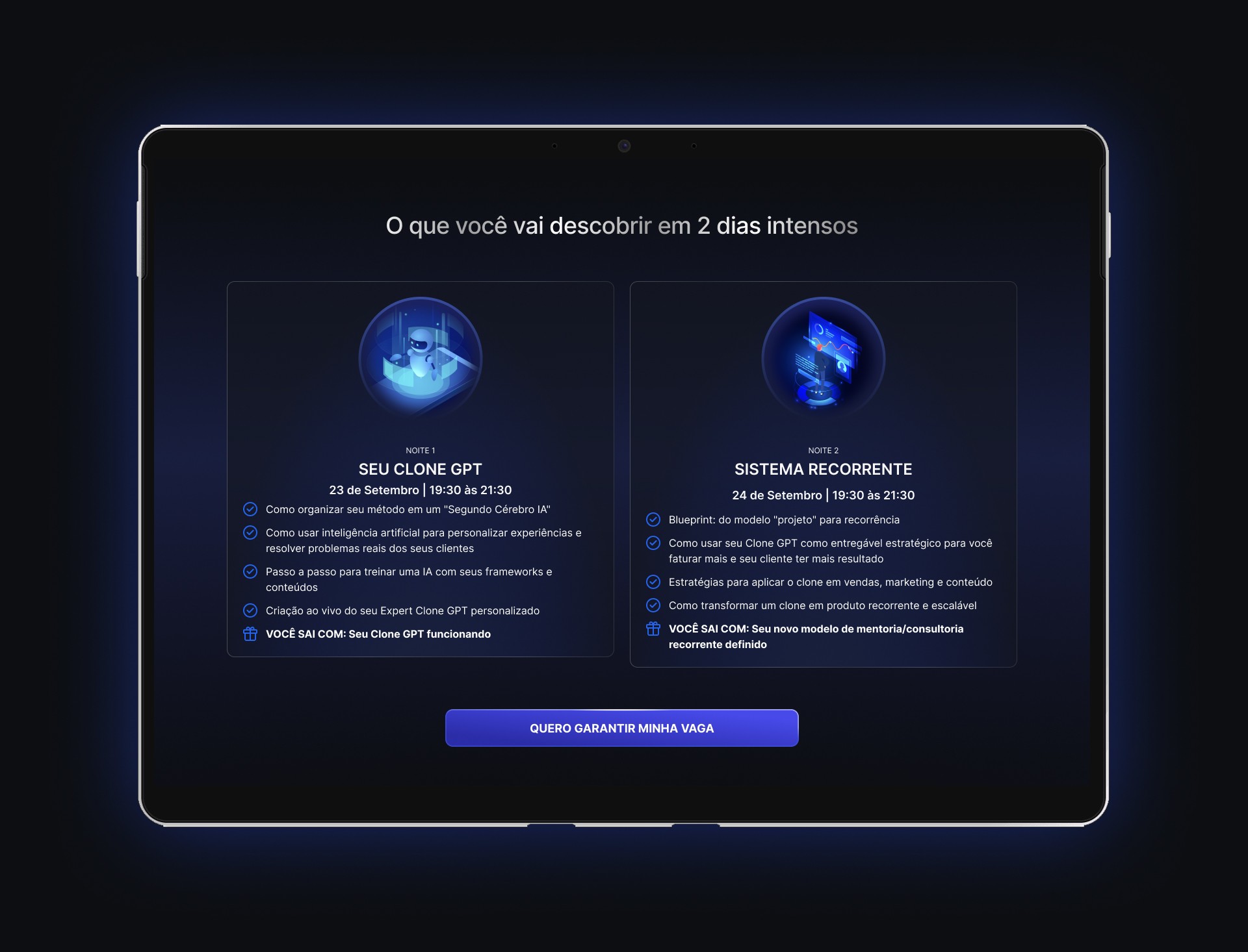 3. Proposta de Valor (O "O Quê"): Após estabelecer a relevância, a página detalha a entrega de valor. Uma seção dedicada explica o conteúdo dos dois dias de workshop, com o apoio de ilustrações tecnológicas que reforçam o tema e tornam o conteúdo mais didático. Em seguida, os palestrantes são formalmente apresentados para construir autoridade.