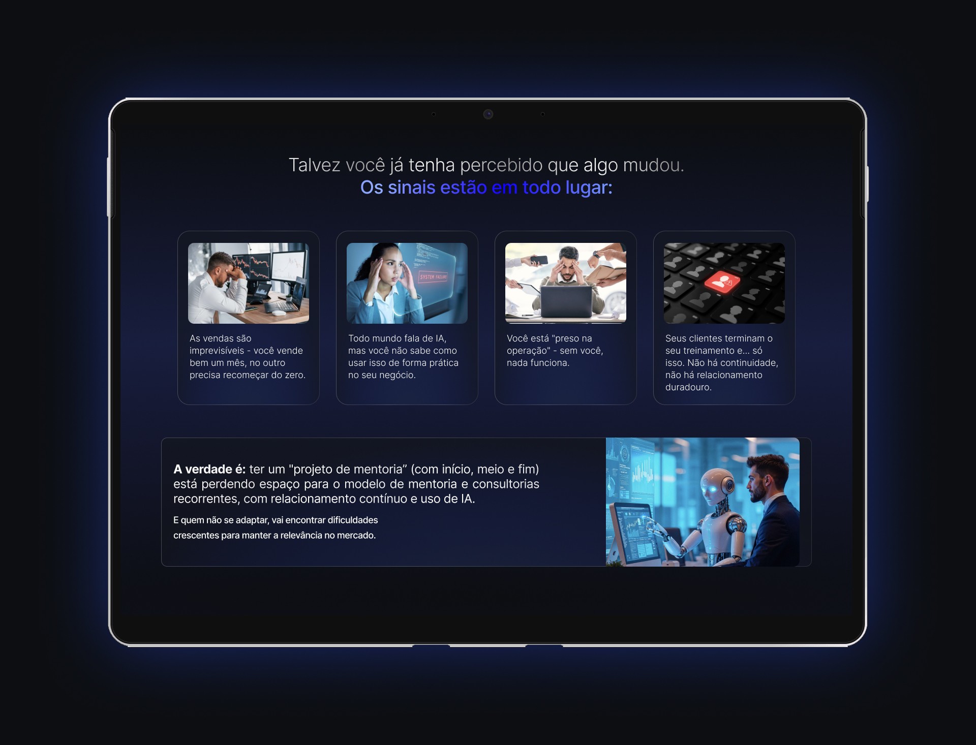 Este projeto consistiu na criação de uma landing page de alta conversão para o "Mentor[IA]", um workshop focado em inteligência artificial. O objetivo da página era servir como a principal ferramenta de vendas do evento, detalhando sua proposta de valor e guiando o usuário até a compra do ingresso.